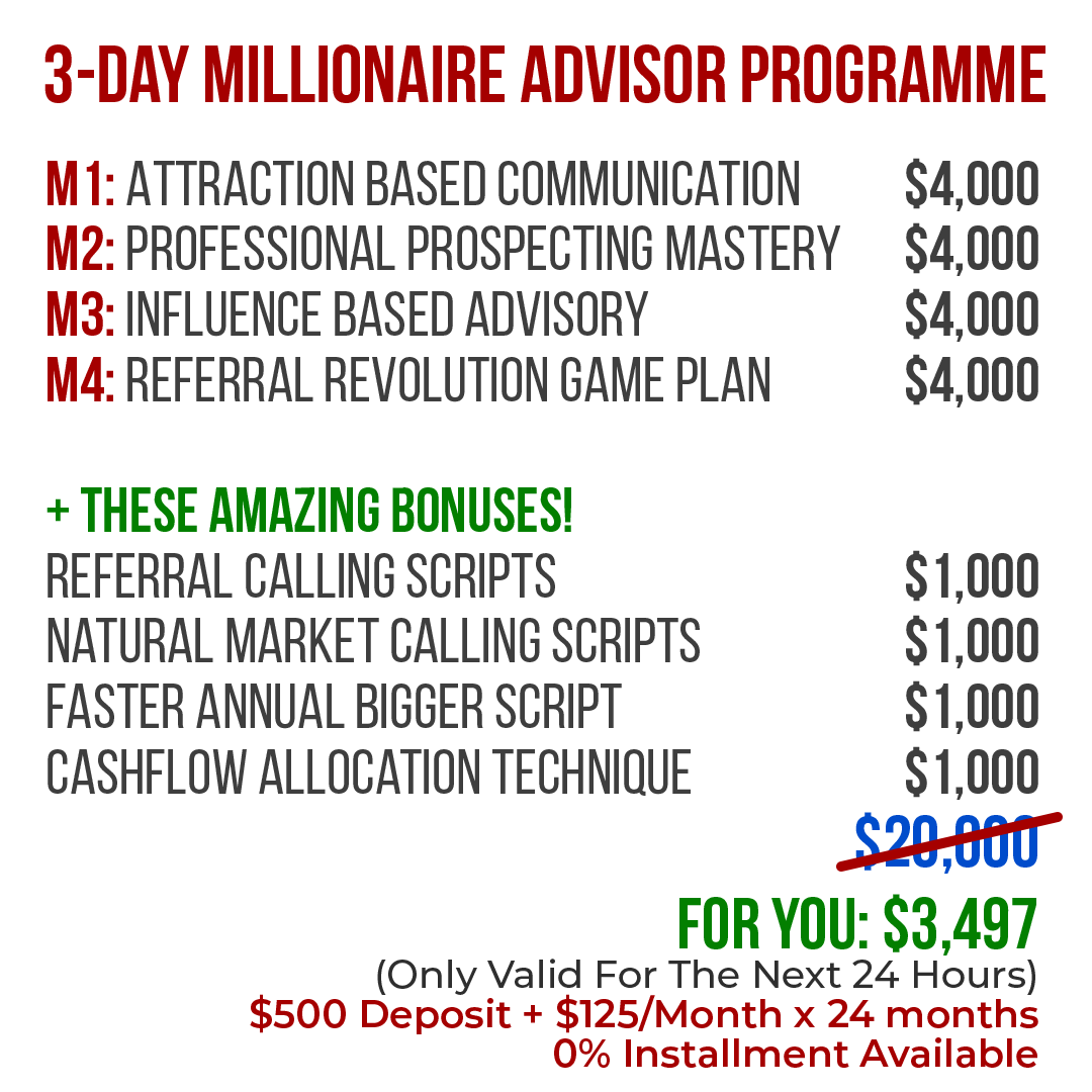 One-time special price only for MAP Students: You can get access to the Profit In Crisis Series Online group for a low low price! This video training series consists of 8 hours of scripts and strategies for you to turn this pandemic into an opportunity to sell more investments, complete with tried and tested advisory models!